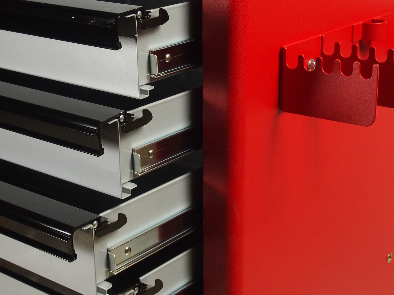 Каждый ящик оборудован двумя индивидуальными фиксаторами, которые предотвращают произвольное открытие ящика во время передвижения тележки.