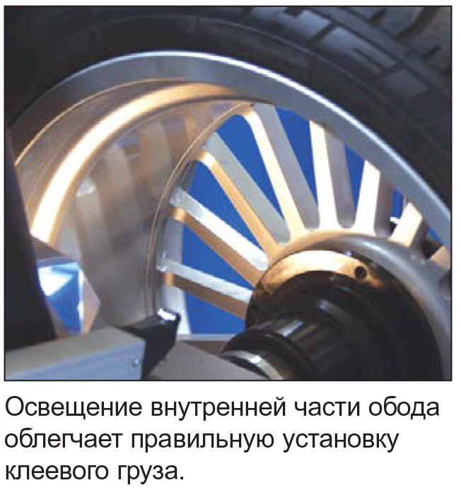 При начале перемещения измерительного устройства geodata включается галогеновая лампа, освещающая внутреннюю часть обода. Оператор видит в зеркале положение клеевого груза.
