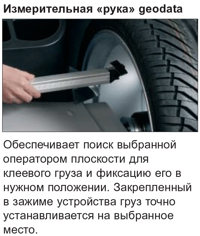 - Измерительное устройство geodata™ обеспечивает полуавтоматический ввод диаметра расстояния и ширины обода (geodata™ 3D) и позиционирование клеевых грузов с помощью зажима для грузов (патент)
