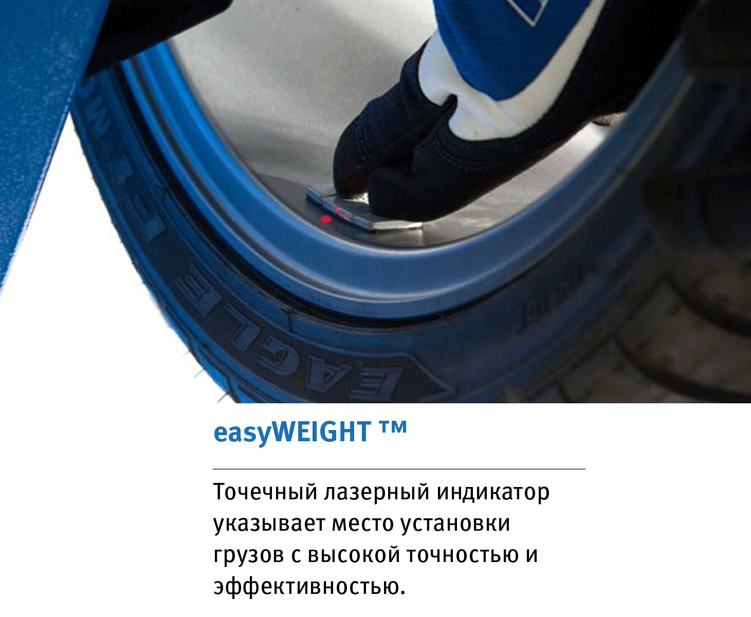 Функция easyWEIGHT Точечный лазерный указатель обеспечивает быструю, точную и удобную установку клеевого груза на ободе. Место установки груза указывается в нижней части обода, что обеспечивает удобную, быструю, точную и безошибочную работу оператора.