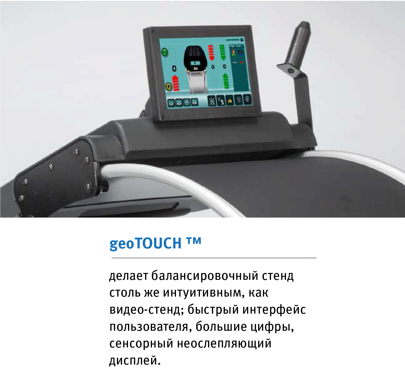 geoTOUCH Интуитивный и быстрый интерфейс пользователя. Большие цифры, сенсорный неослепляющий дисплей, а также автоматическим вводом места установки грузов в режиме easyALU.