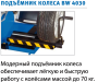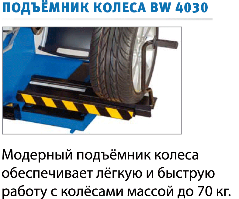 Модерный подъёмник колеса обеспечивает лёгкую и быструю работу с колёсами массой до 70 кг. Колесо автоматически поднимается на высоту, использованную при последней балансировке, а затем платформа автоматически опускается в исходное положение. Это снижает время полного цикла «с пола на пол».