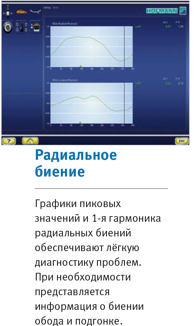 - Индикация результатов обеспечивает определение причин вибраций, вызванных радиальными биениями, и снижение их за счёт геометрической подгонки (оптимального взаимного положения обода и шины).