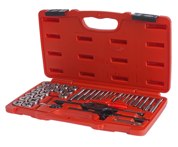 Метчики и плашки (34 ед.) M3x0.5, M3x0.6, M4x0.7, M4x0.75, M5x0.8, M5x0.9, M6x0.75, M6x1.0, M7x0.75, M7x1.0, M8x1.0, M8x1.25, M10x1.25, M10x1.5, M12x1.25, M12x1.5, 1/8NPT27
