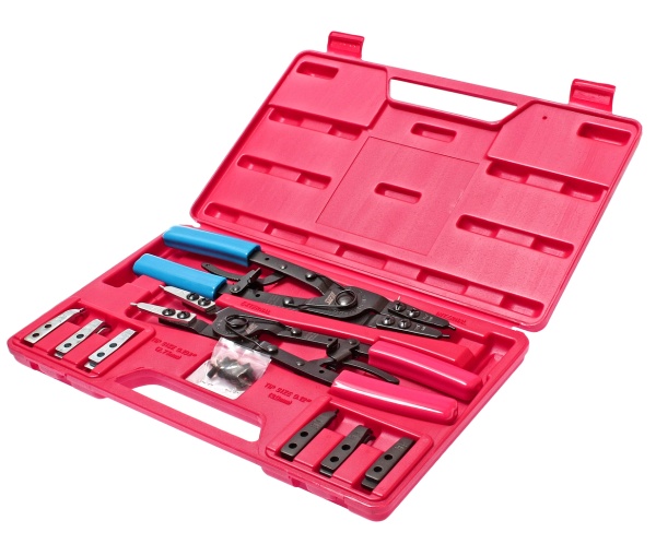 В набор входят сменные наконечники. Клещи с механизмом фиксации позволяют удерживать стопорные кольца, предохраняя их от повреждения.
